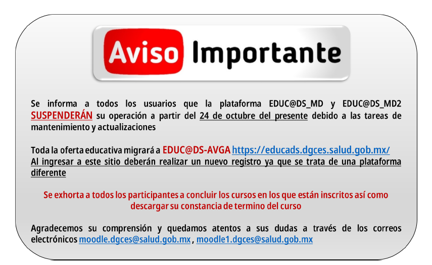 Le damos la más cordial Bienvenida a la plataforma EDUC@DS_MD, espacio académico para los profesionales de la salud y que participan en la atención médica en México.